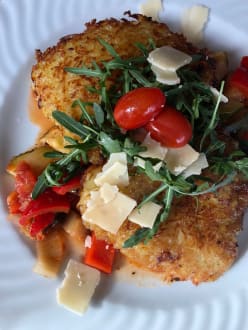 hausgemachte Röstis auf Ratatoille-Gemüse mit Rucola und Parmesanspänen garniert