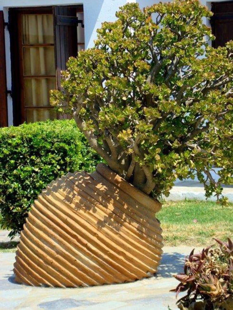 kwiaty czy drzewka posadzone w pieknych wielkich donicach w ogrodzie hotelu