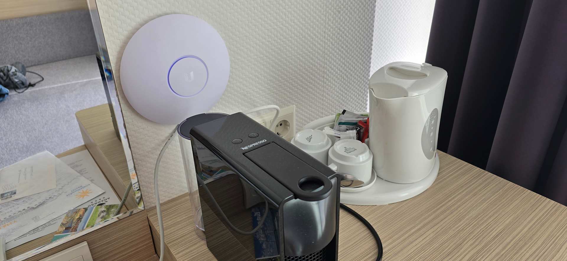 hinten ist der Hotspot für das WLAN- Das Internet ist ausreichend schnell um zu streamen. Leider gab der blaue LED Ring nacht soviel Licht in das Zimmer das man sich orientieren konnte. Morgens, sechs Uhr, startete das Teil neu.