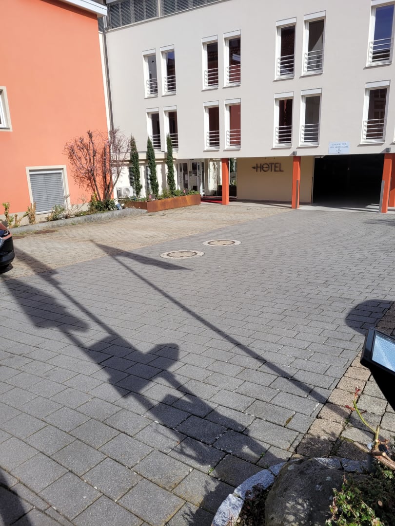 Hoteleingang mit Parkplatz hinten. Zugang zur Rezeption