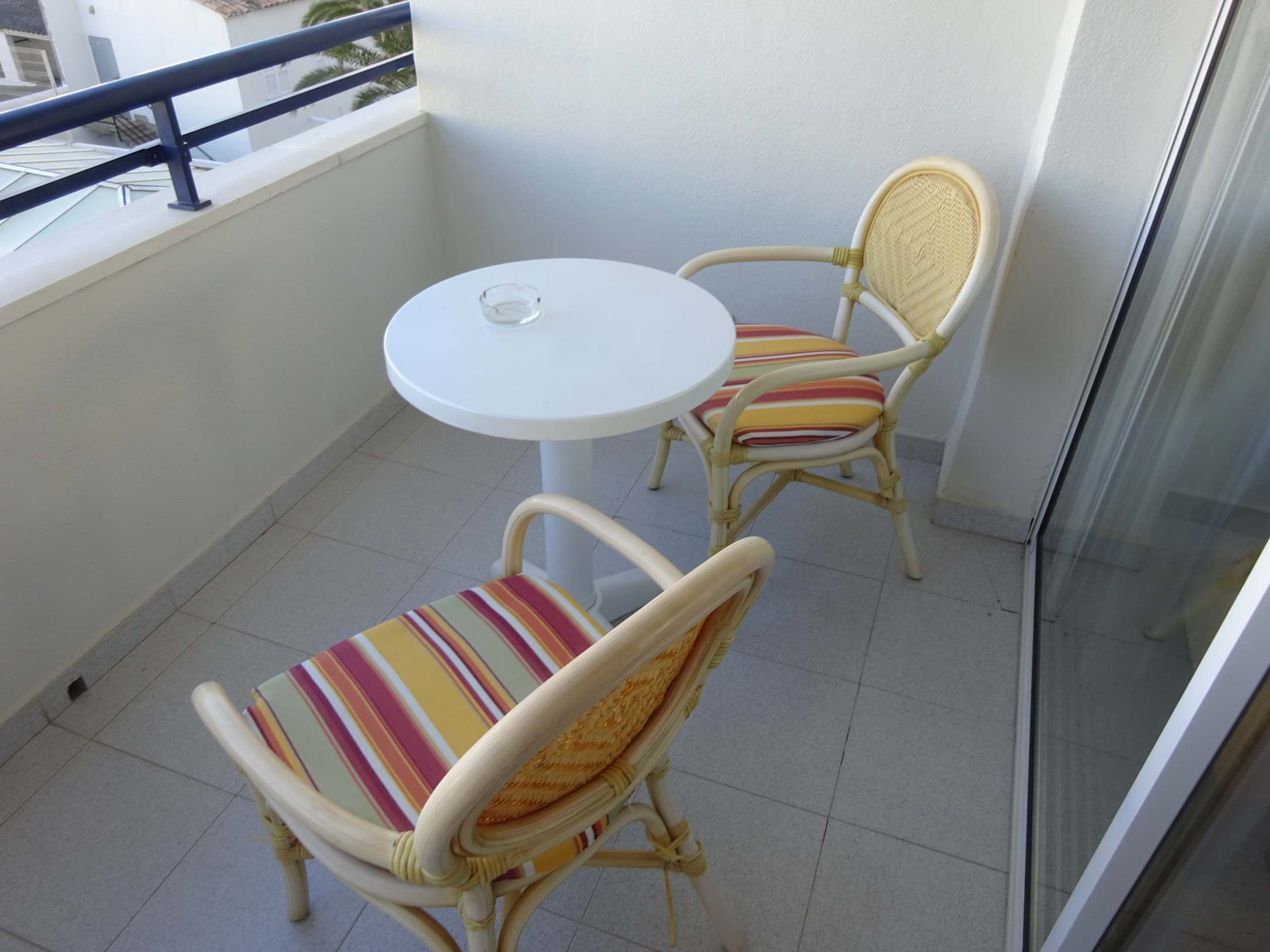 Balkon mit 2 Stühlen und Tischchen