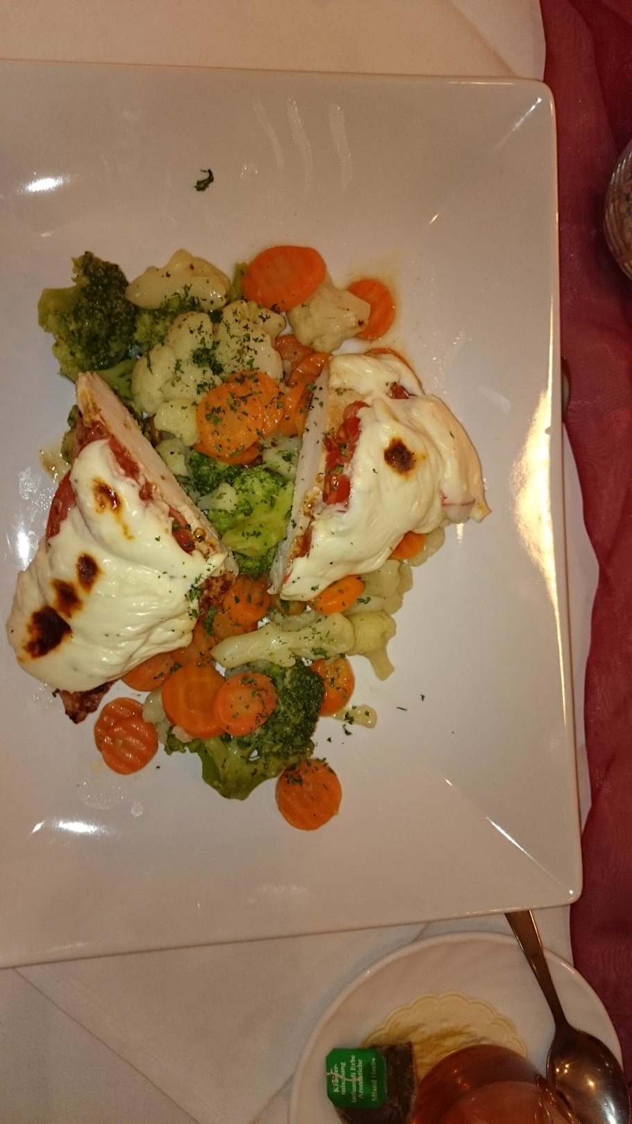 Mit viel Liebe zubereitetAuf Wunsch Gemüse mit Pute und Tomaten mit Käse überbacken.Sehr lecker!!!