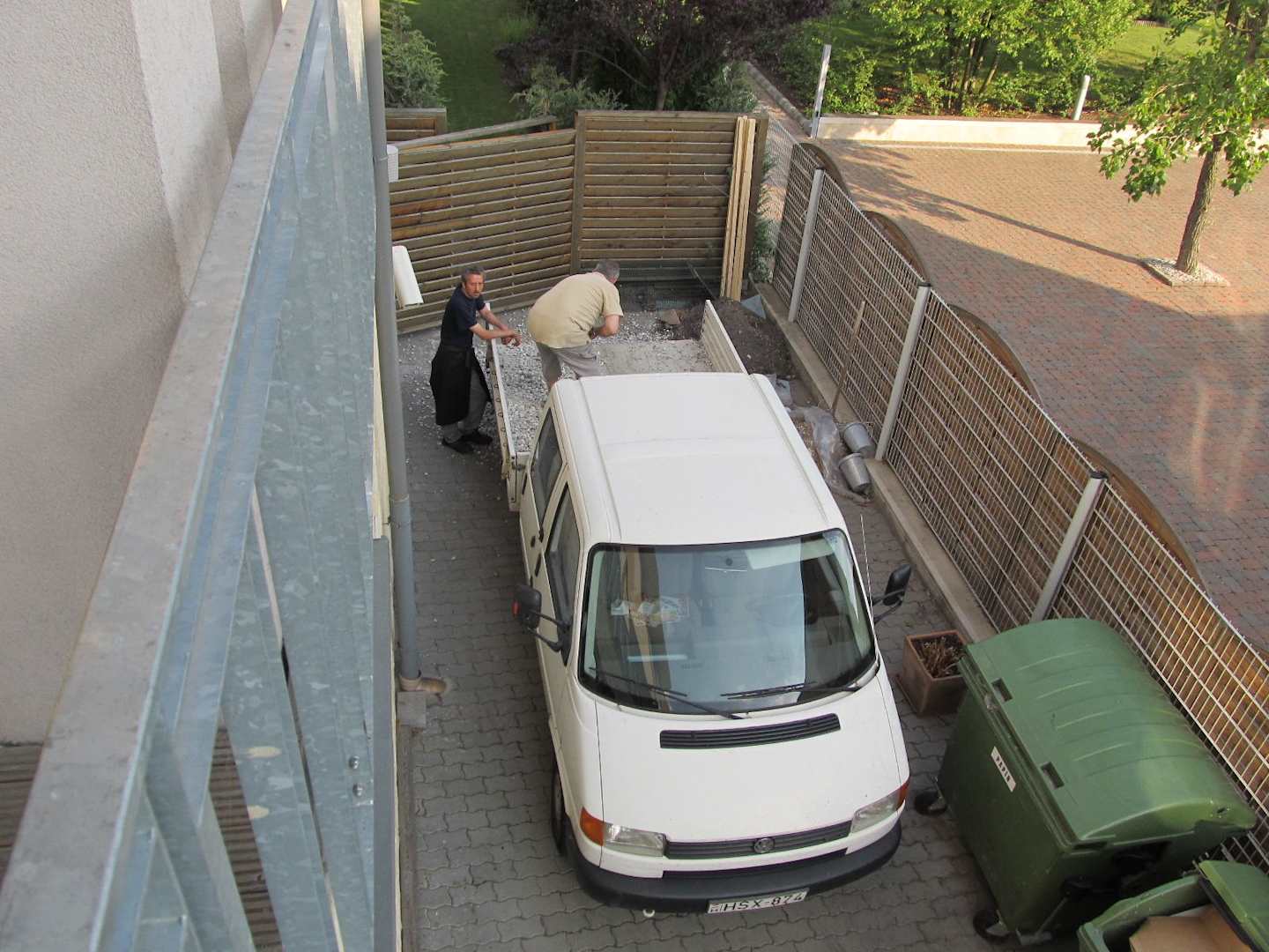 Hier wird gerade vor unserem Zimmer Kies abgeladen. Ansonsten hielten dort auch die LKWs, die die Küche belieferten. Immerhin - wenn man sich weit genug über das Geländer beugte, konnte man den Balaton sehen.