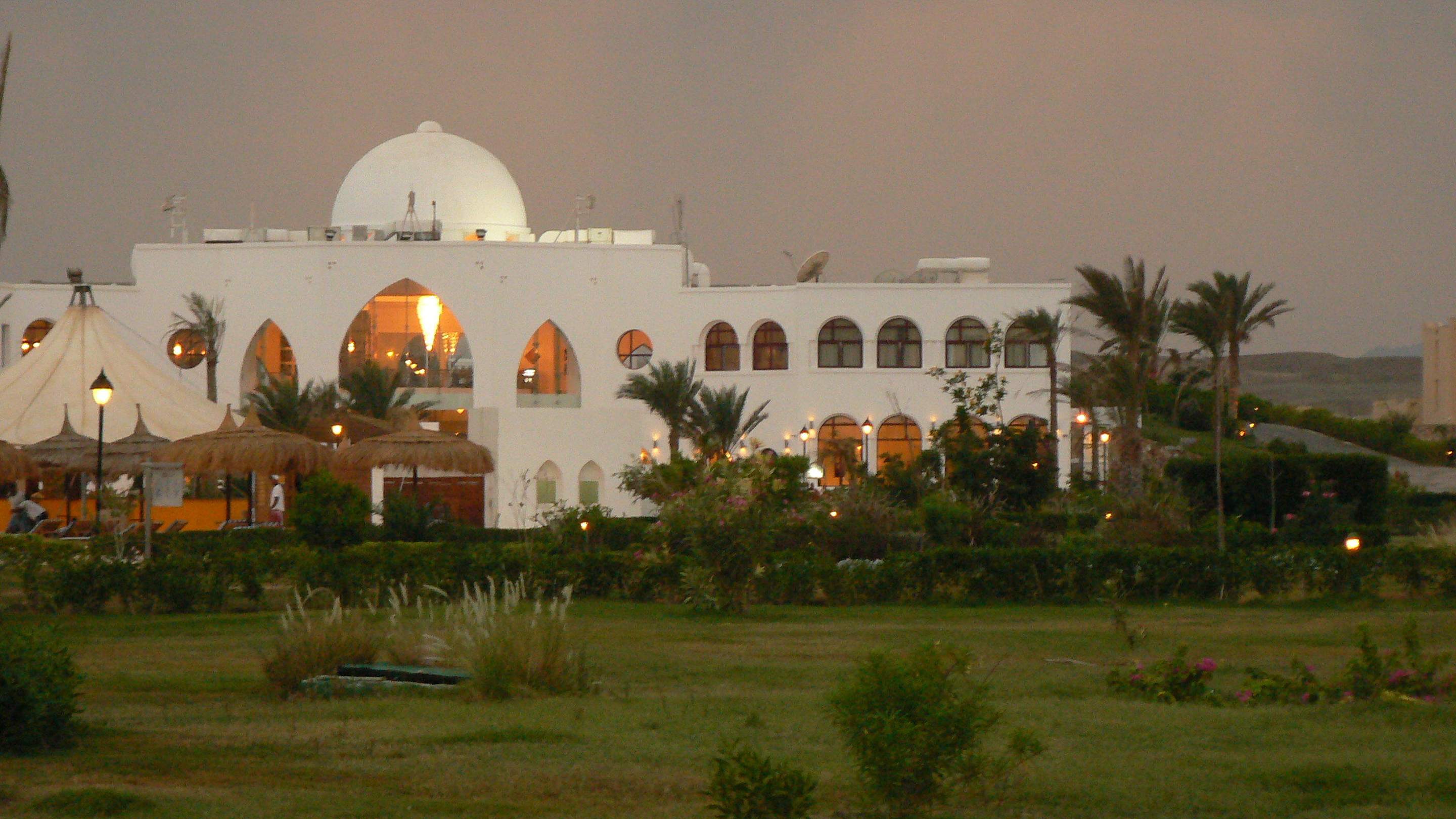 vor dem Gebäude die Gardenbar, abends voll besetzt und so ziemlich das Einzige