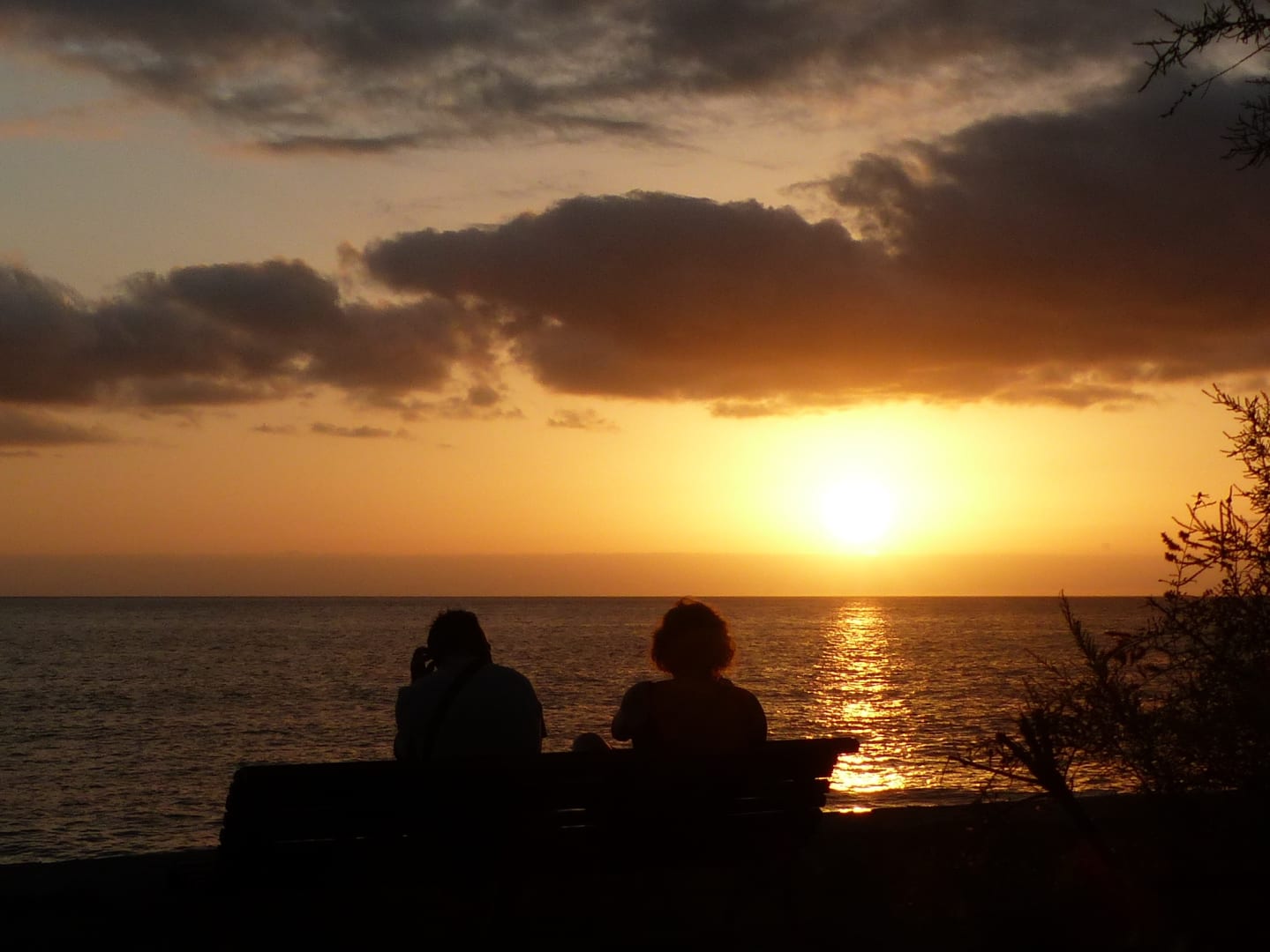 AusblickZum Sonnenuntergang sitzen viele Menschen direkt vor dem Hotel auf der Strandmauer
