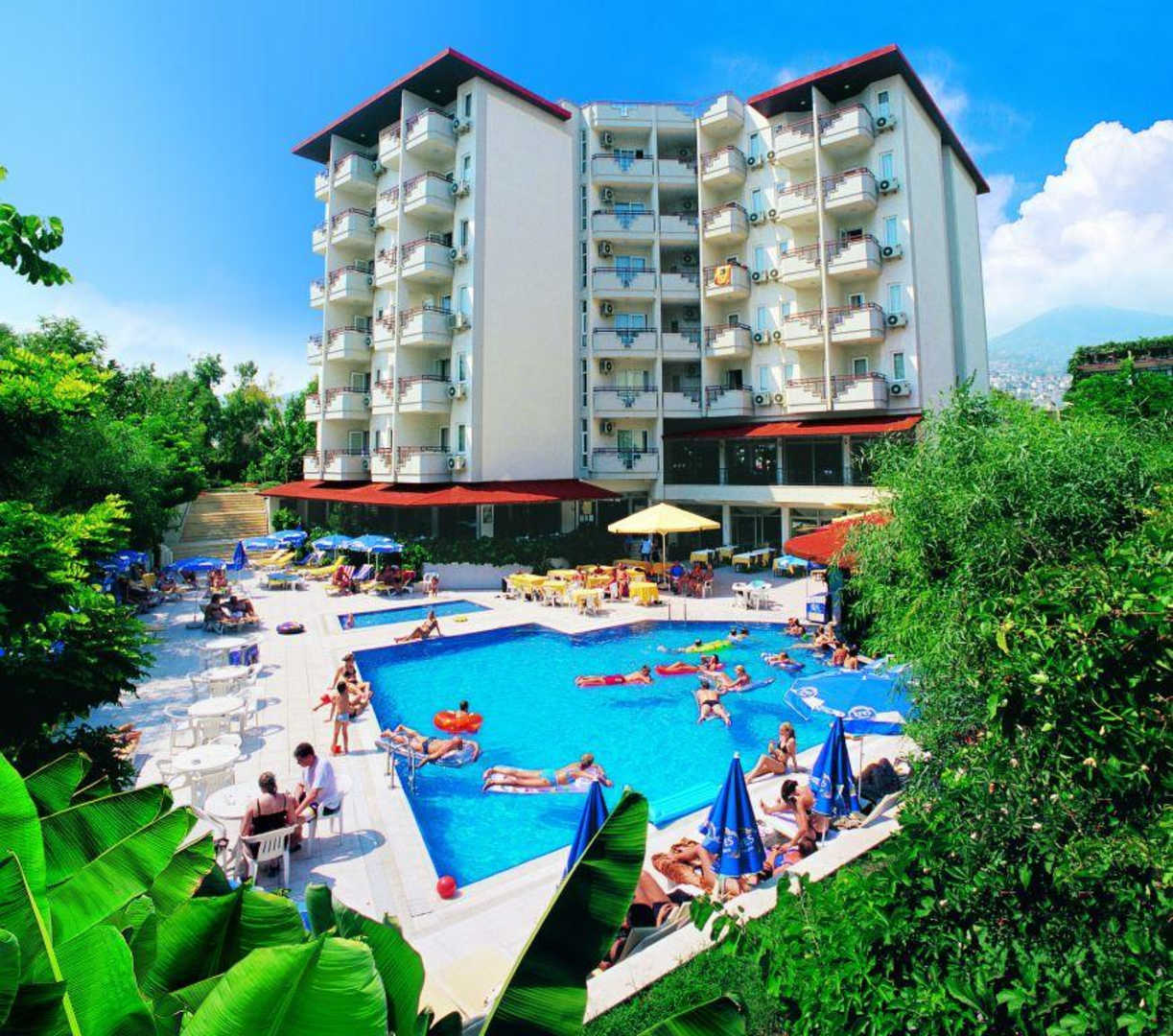 Ansicht auf den Pool mit Hotel