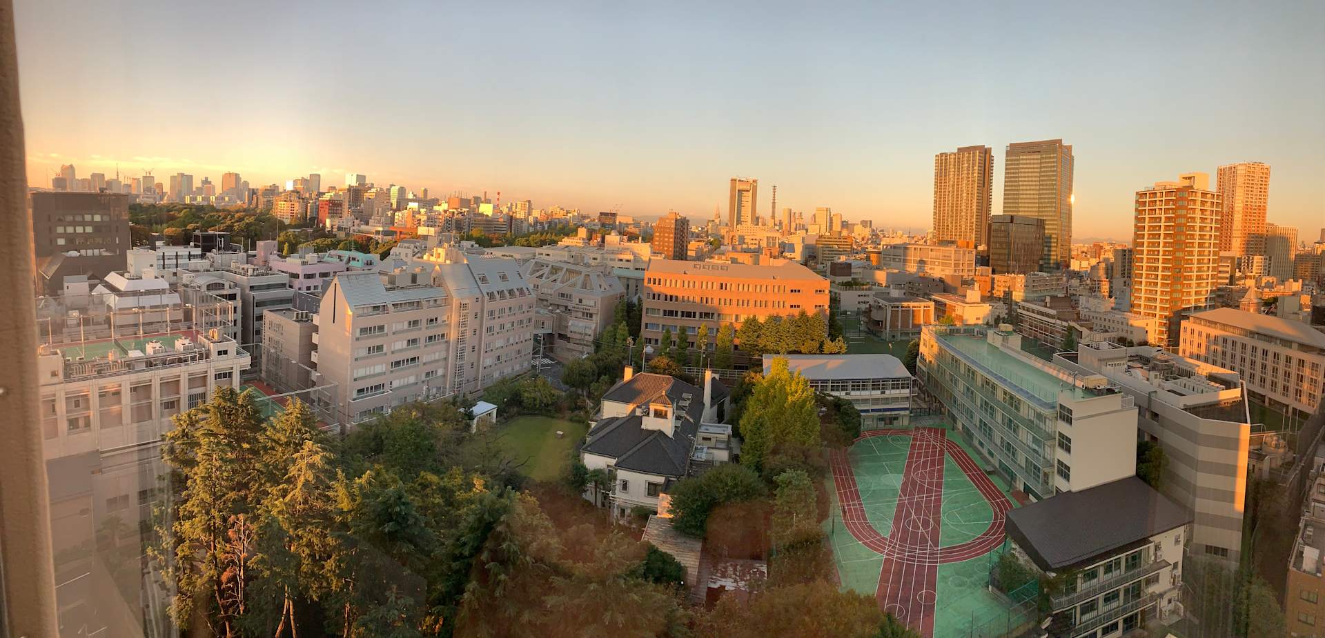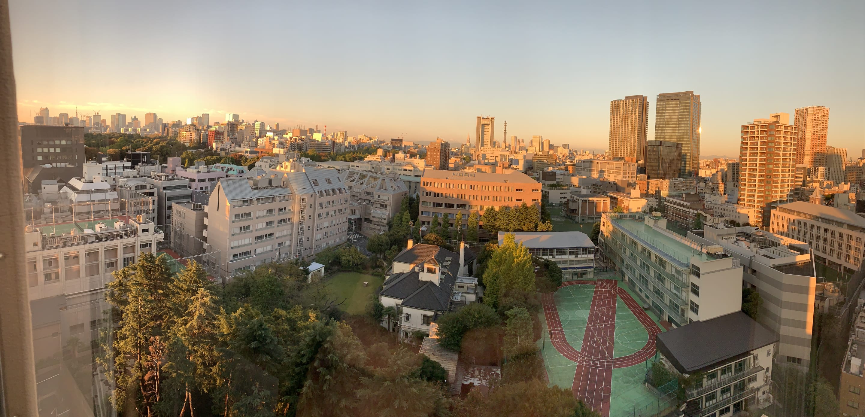 Blick aus dem Zimmer beim Sonnenaufgang; links der kaiserliche Garten