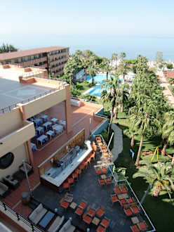 Blick vom Zimmer auf Lobby-Bar, Außenanlage und Meer
