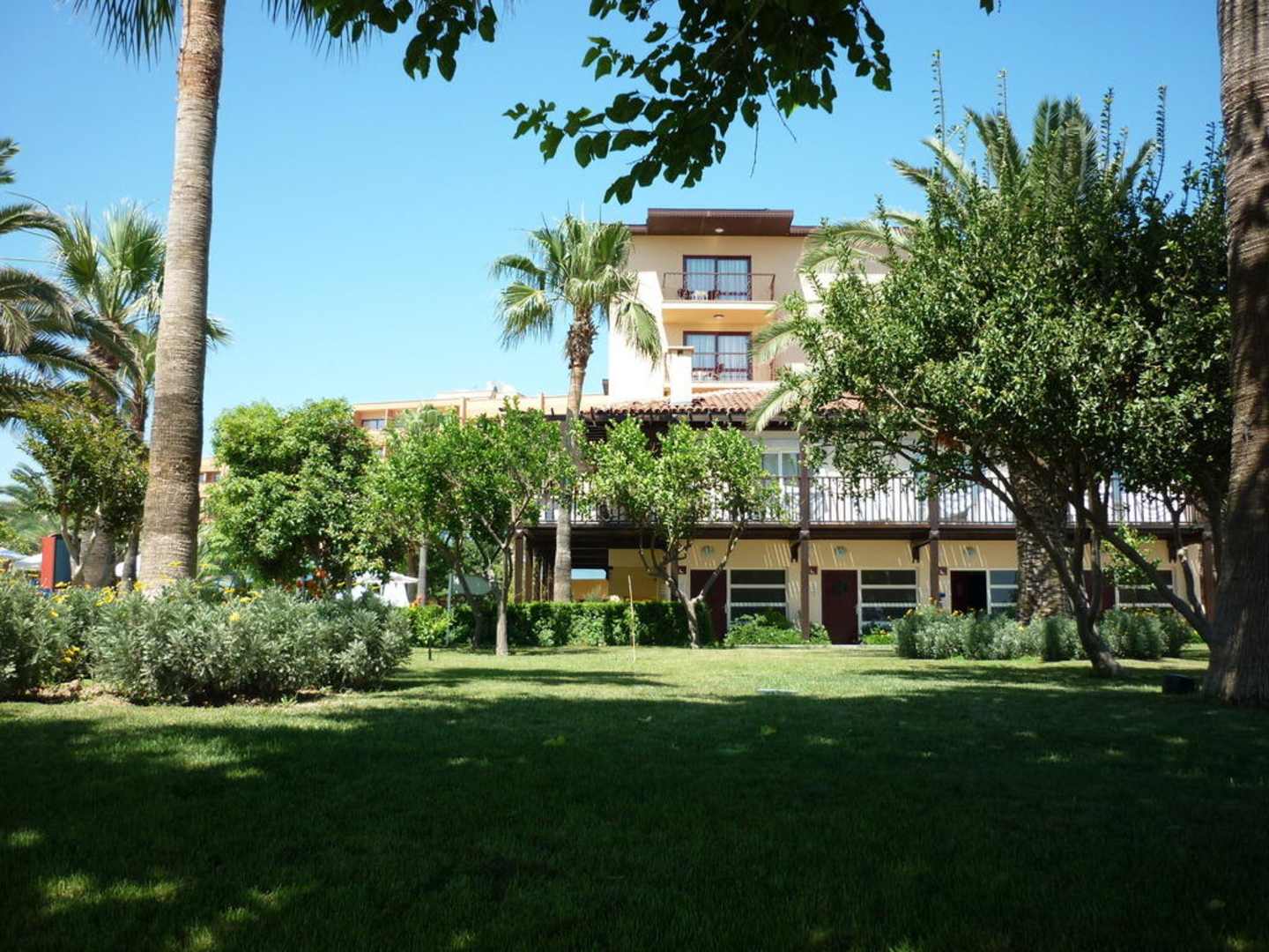 Blick aus der Gartenanlage auf das Hotel