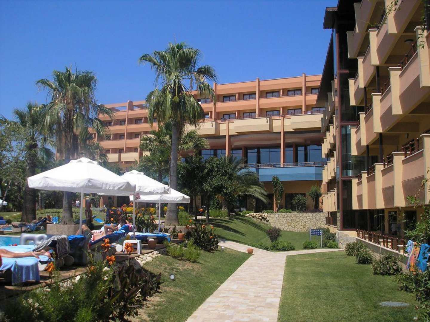 Rechts Hotel, links Pool