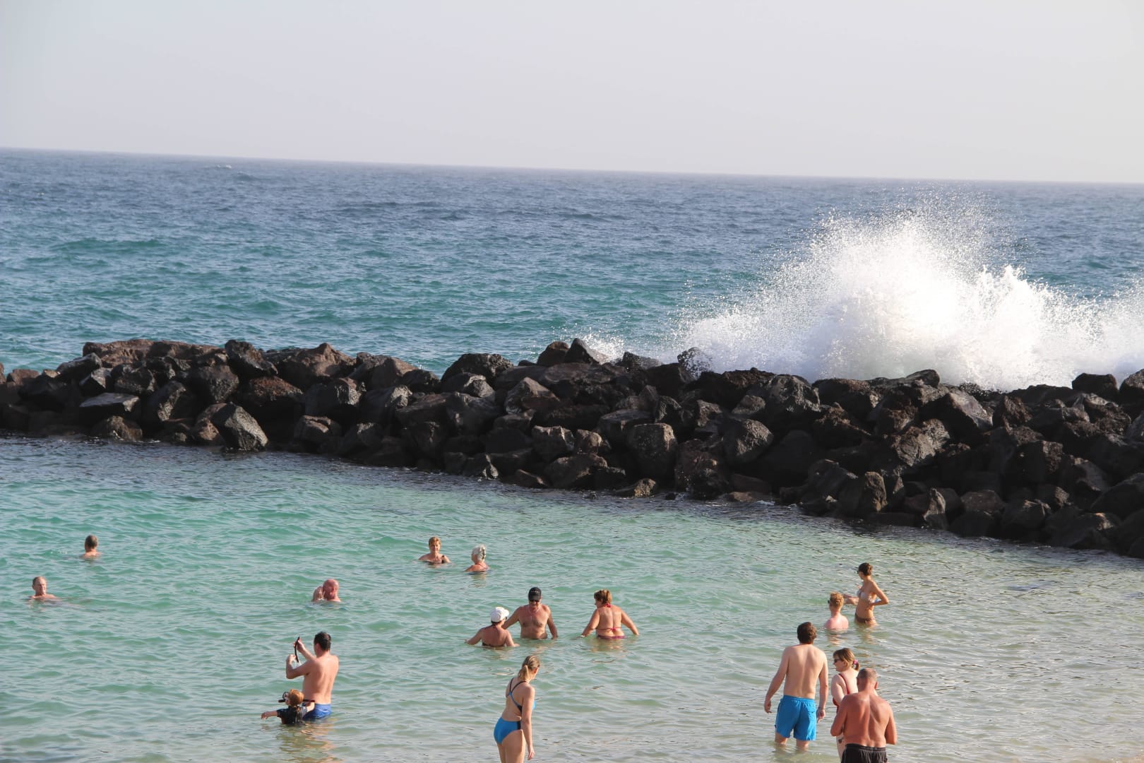 Die Badebucht im Atlantik mit der Gischt Wenn die Gischt über den Schutzwall spritzt