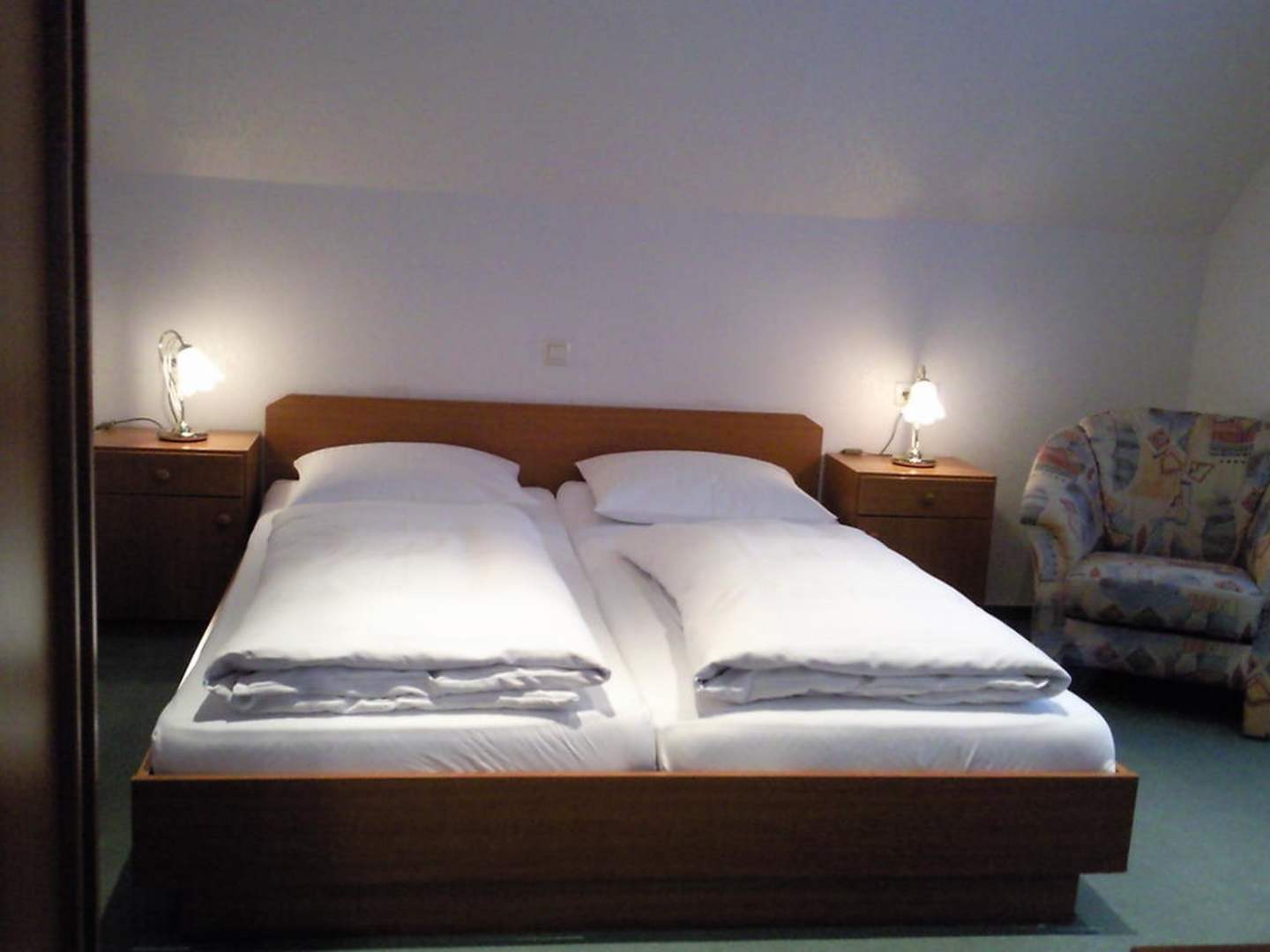 Links der Kleiderschrank, rechts ein Sessel und das Fenster.