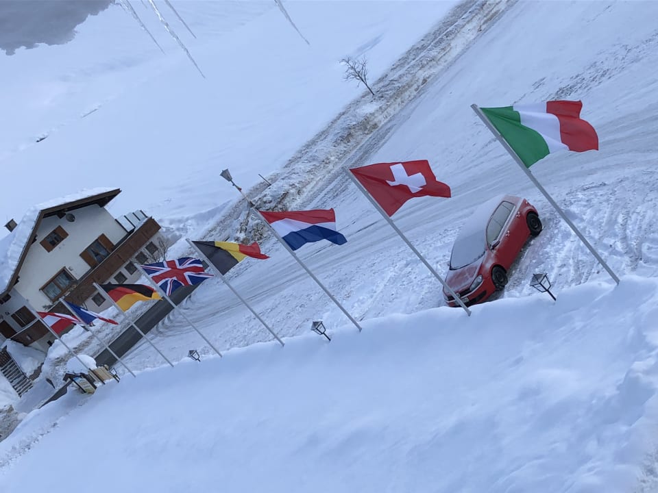 fahnengesäumte Einfahrt zum Hotel und Parkplatz