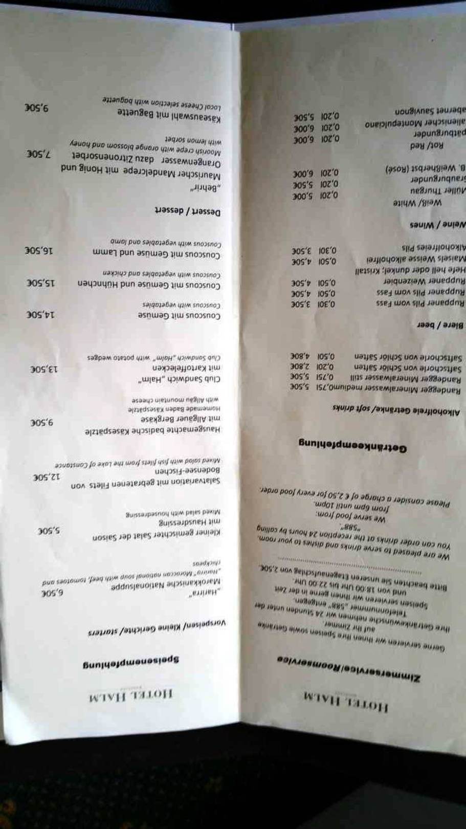Getränke-/Speisenkarte Zimmer