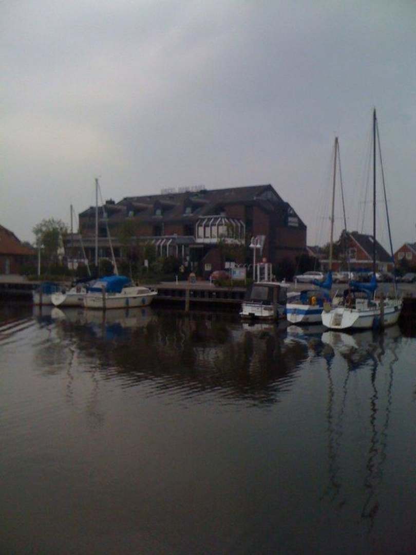 Hotel Harlesiel von außen, davor der Yachthafen!