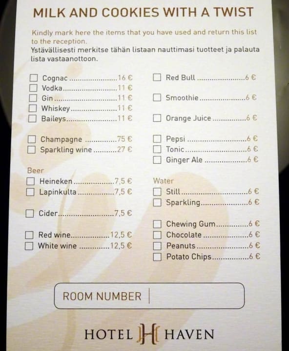 Minibar pricelist