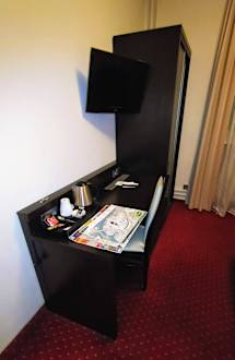 Schreibtisch mit Kaffee-Teezubereiter, Flachbildschirm, Kleiderschrank und Safe