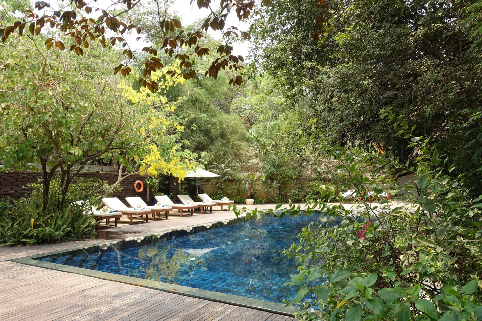 Der Pool an dem abends ein Feuer brennt