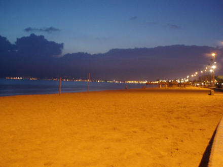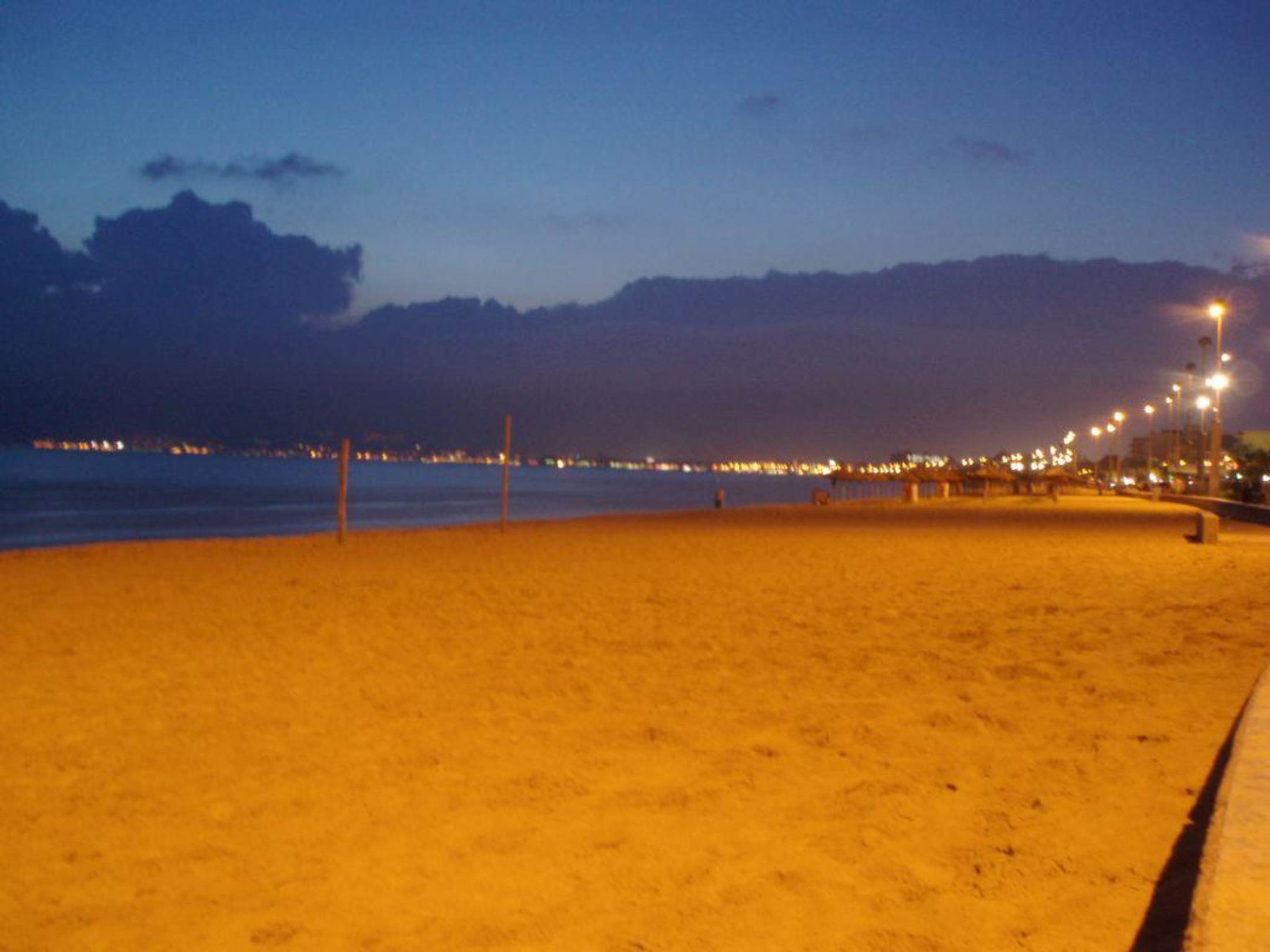 AbendstimmungSicht über den Strand vor dem Hotel Richtung Palma, spät am Abend mit Wolken über den Bergen