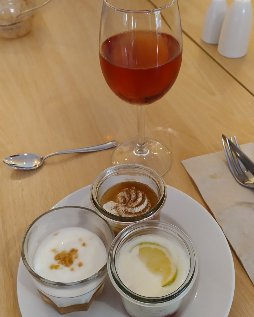 Eine Auswahl leckerer Nachspeisen. Der Wein ist eher nicht zu empfehlen.