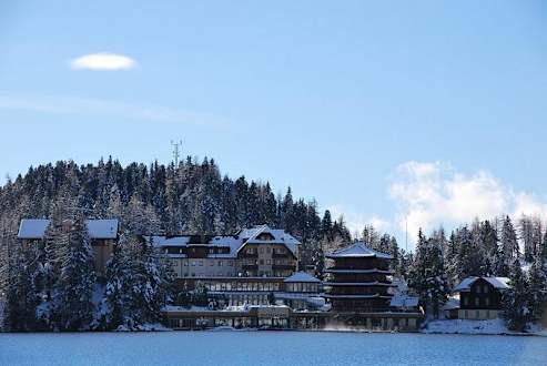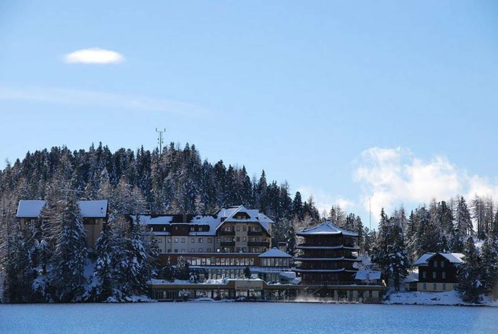 Das Hotel vom gegenüber liegenden Seeufer aufgenommen