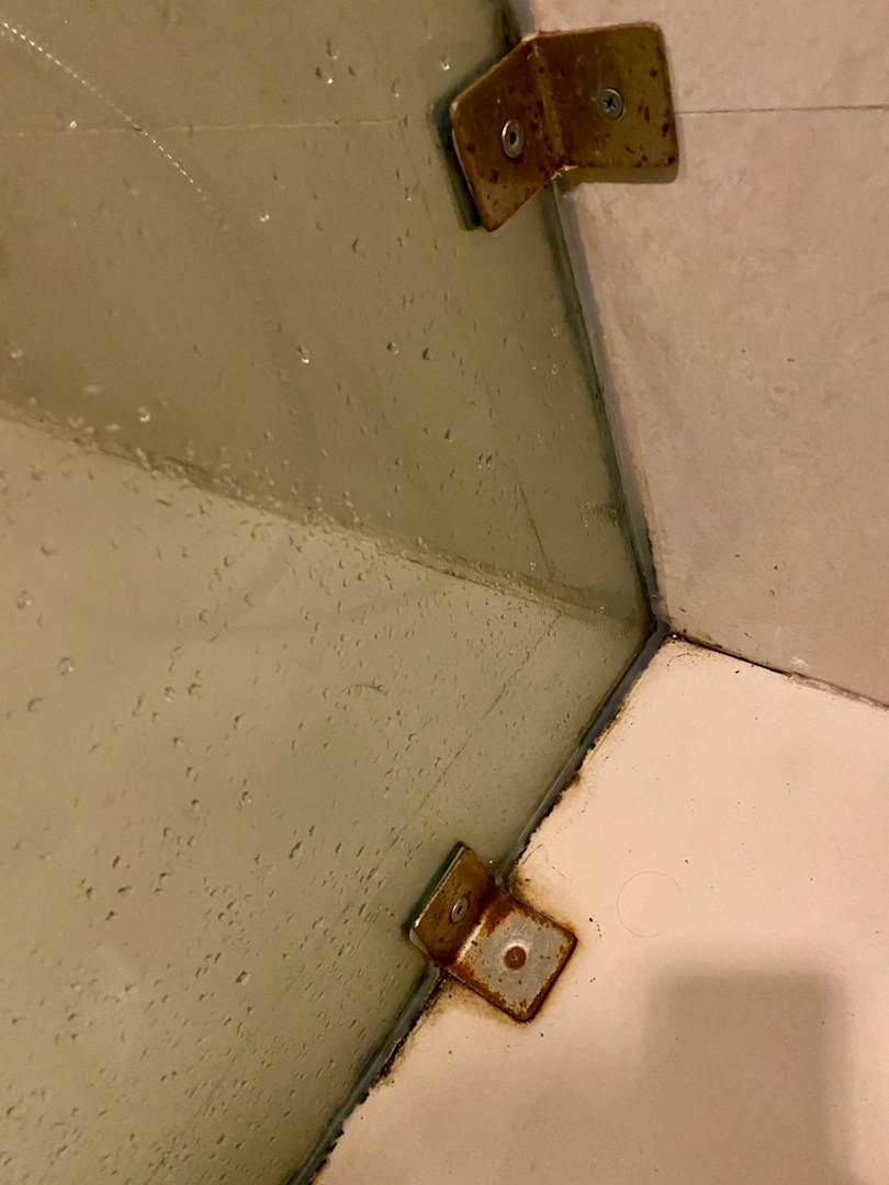 Zimmerverschimmelte Kanten der Duschabtrennung; Zum teil verrostete Armaturen und Verschraubungen