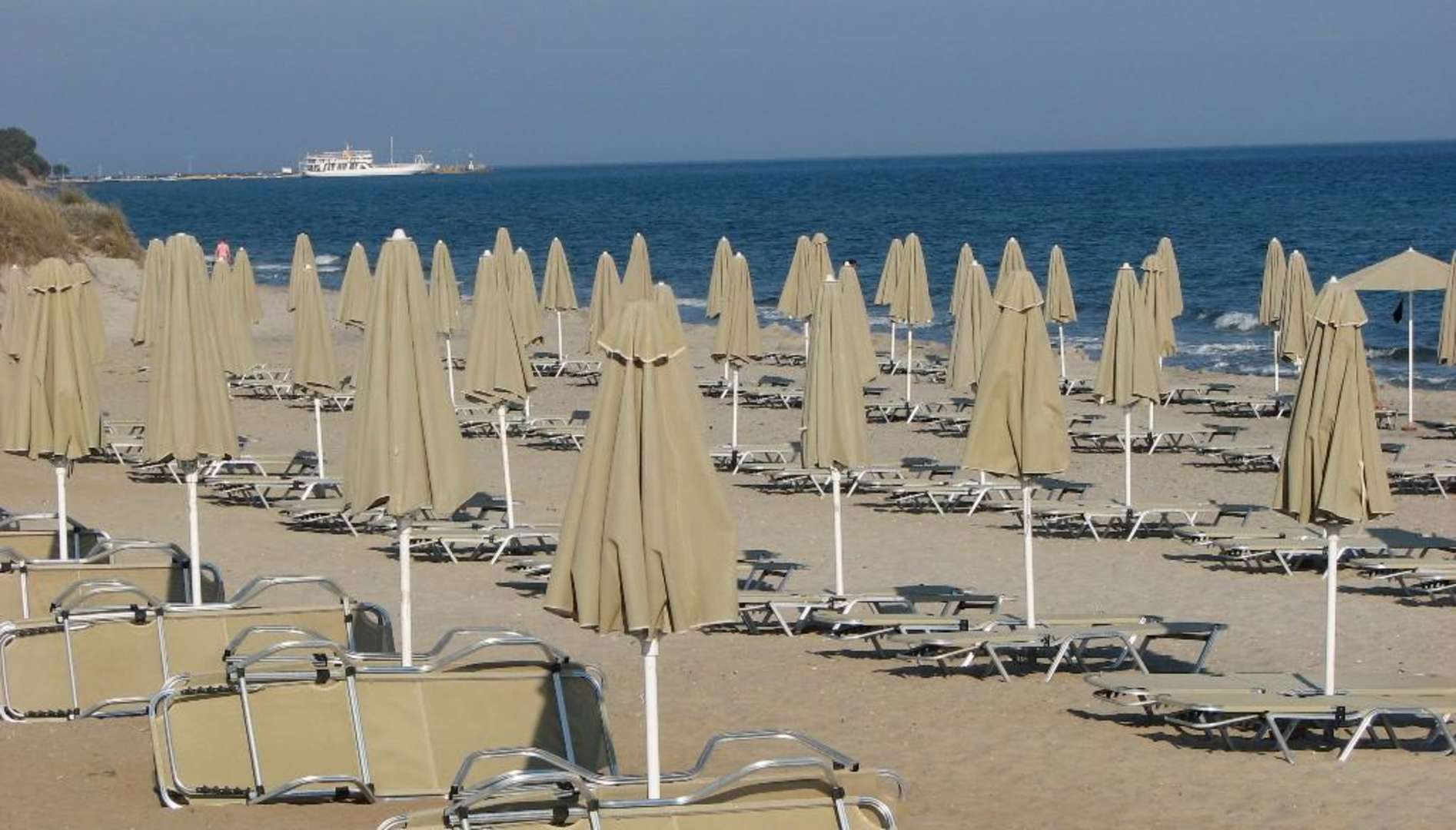 Strand2Im Hintergrund eine Fähre im Hafen von Mastichari.