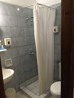Veraltetes kleines Duschbad mit klebrigem Vorhang.