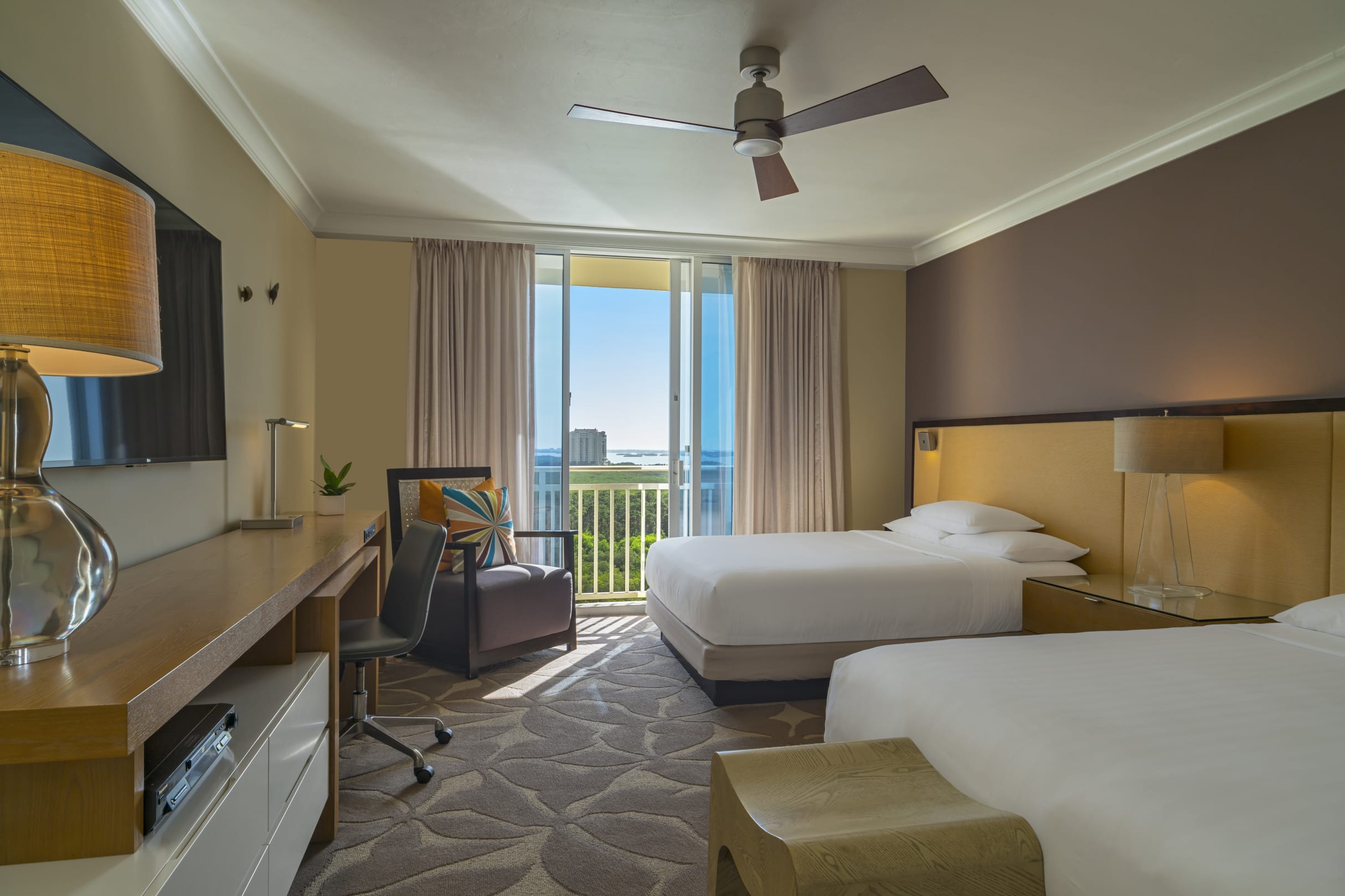 Double queen bed guest room with partial bay view.