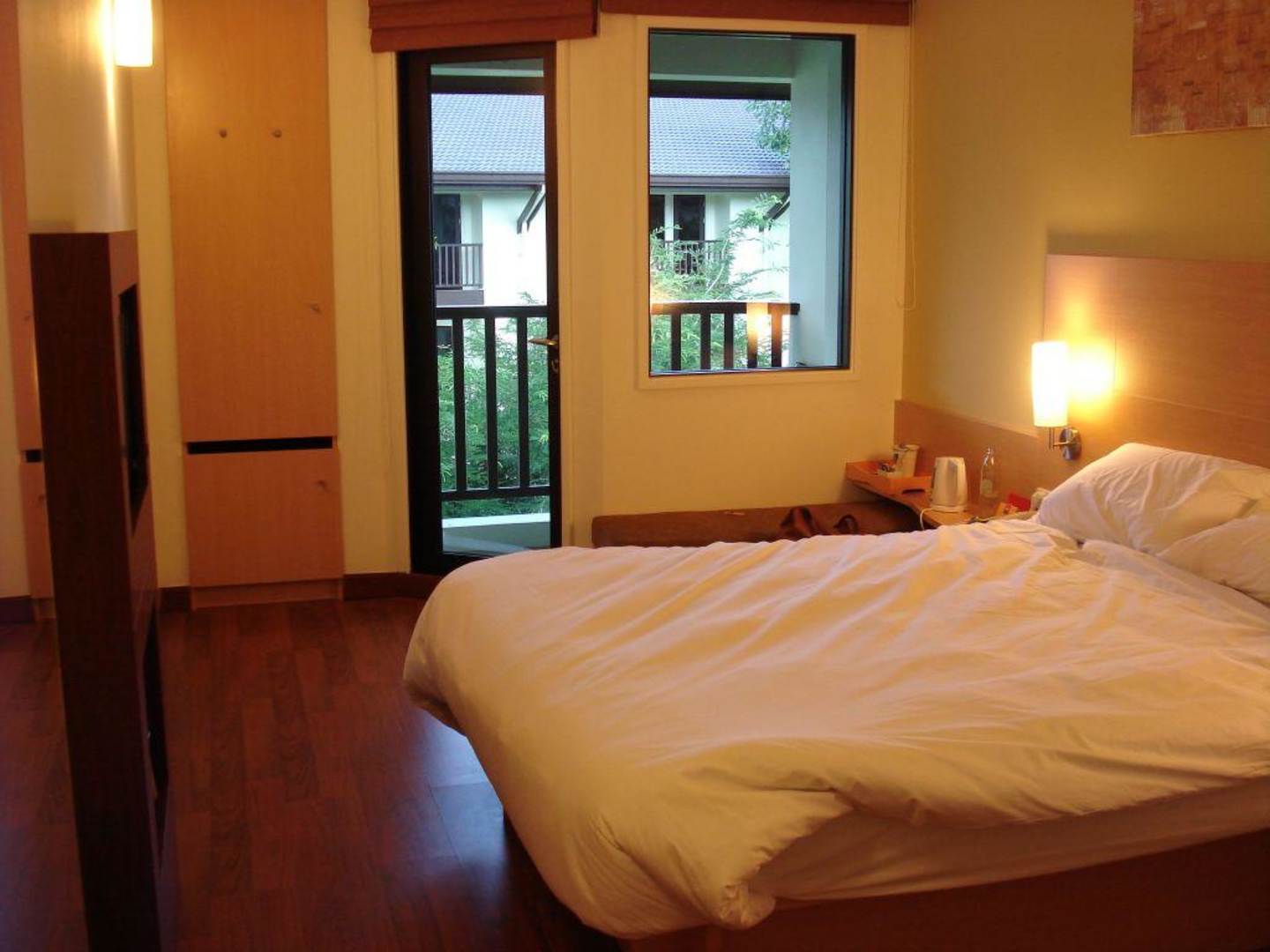 Zimmer Richtung Balkondas winzige (aber zweckmäßige) Zimmer mit Sicht auf den Balkon und Schrank in dem sich der Safe befindet.