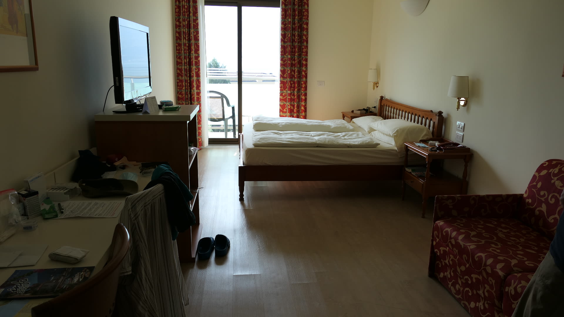 Großer Schreibtisch, ausziehbare Couch. Klimaanlage, Deckenventilator und Kühlschrank sind ein Muss bei der enormen Hitze mit extrem hoher Luftfeuchtigkeit von ca. 80 - 90 %