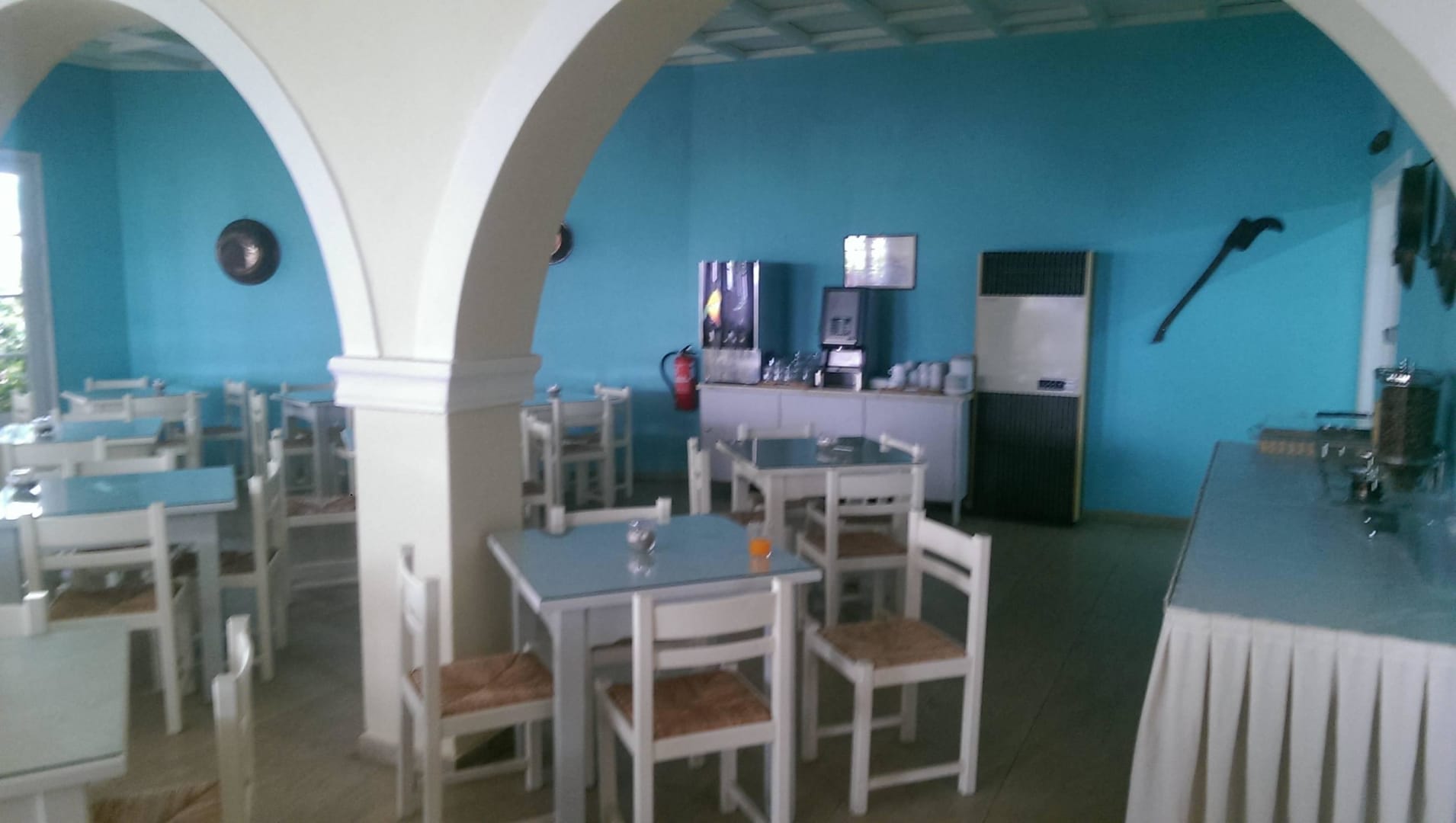 Der rechte Tisch trägt das Frühstücksbuffet