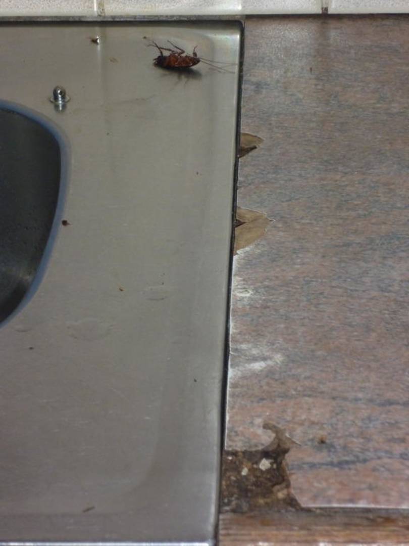 Defekte Arbeitsfläche an der Spüle mit Kakerlake