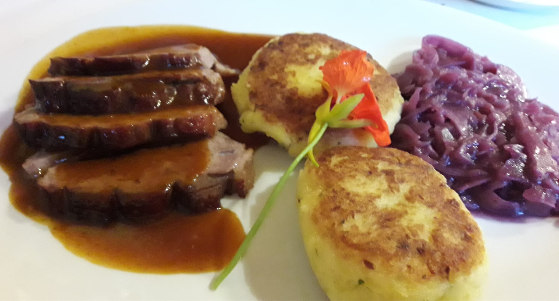 Barbarie-Entenbrust mit Orangen-Honigsafterl mit Kartoffellaibchen und Blaukraut