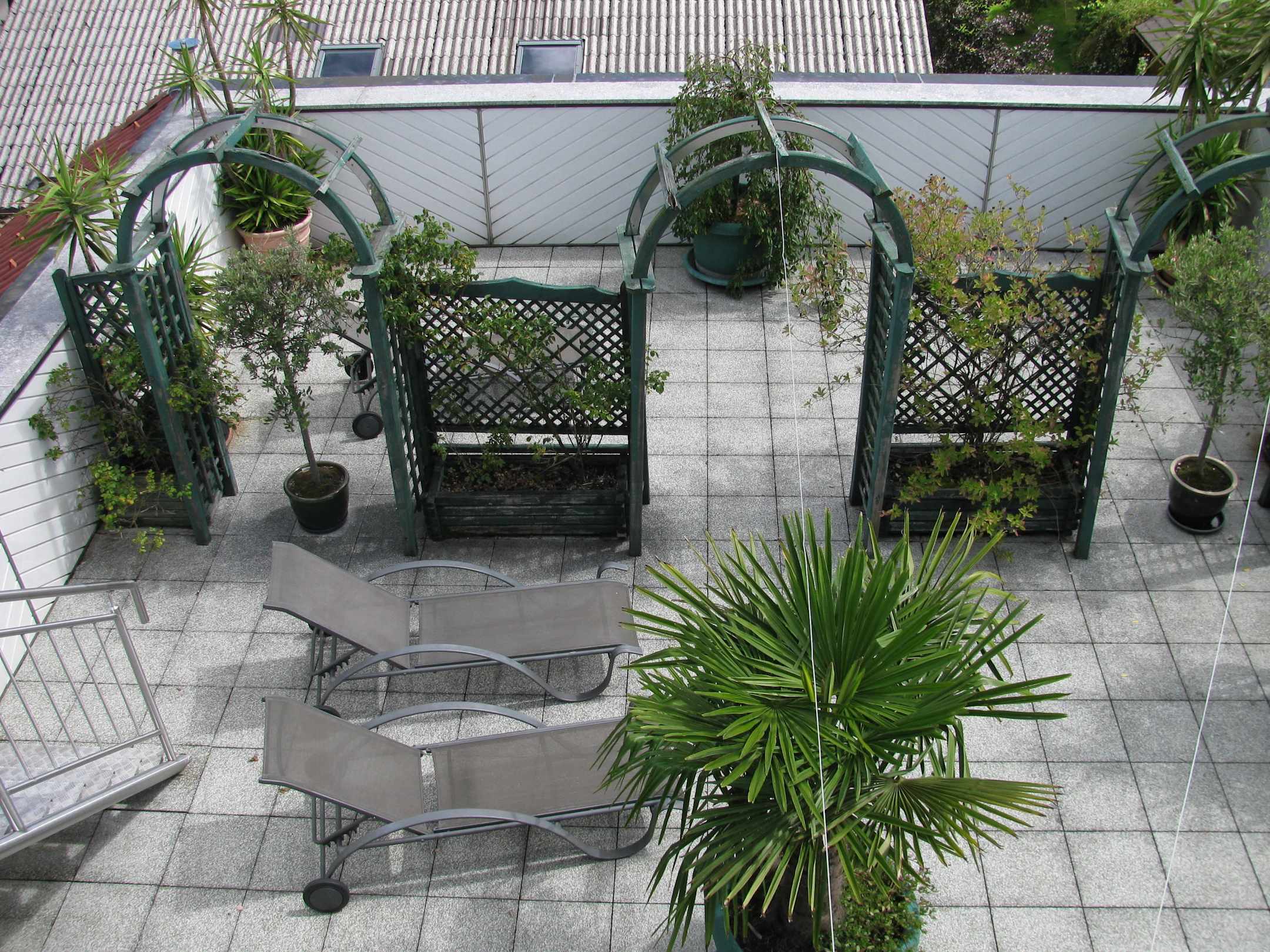 Blick auf die Dachterrasse mit Liegen