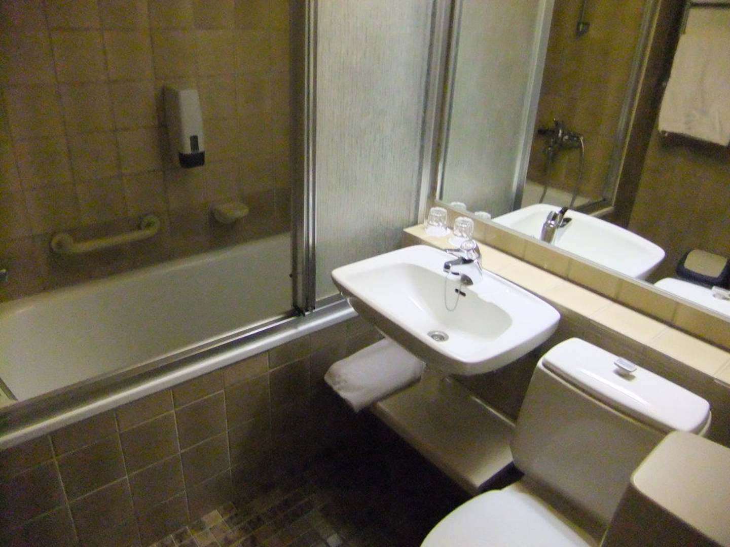 Bad, ausgestattet mit Badewanne, WC und Waschbecken, keine Adapter nötig.