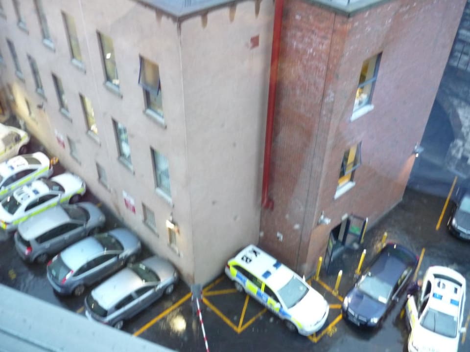 Ausblick aus dem Zimmer in den Innenhof, direkt zur Polizeiwache.