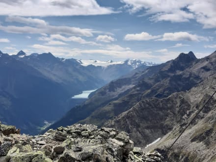 Blick vom roten Schrofen auf Gepatsch-Stausee und Gletscher.