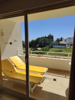Balkon mit 4 Stühlen Tisch und 2 Liegen im Block B 2ter Stock hinteres Haus