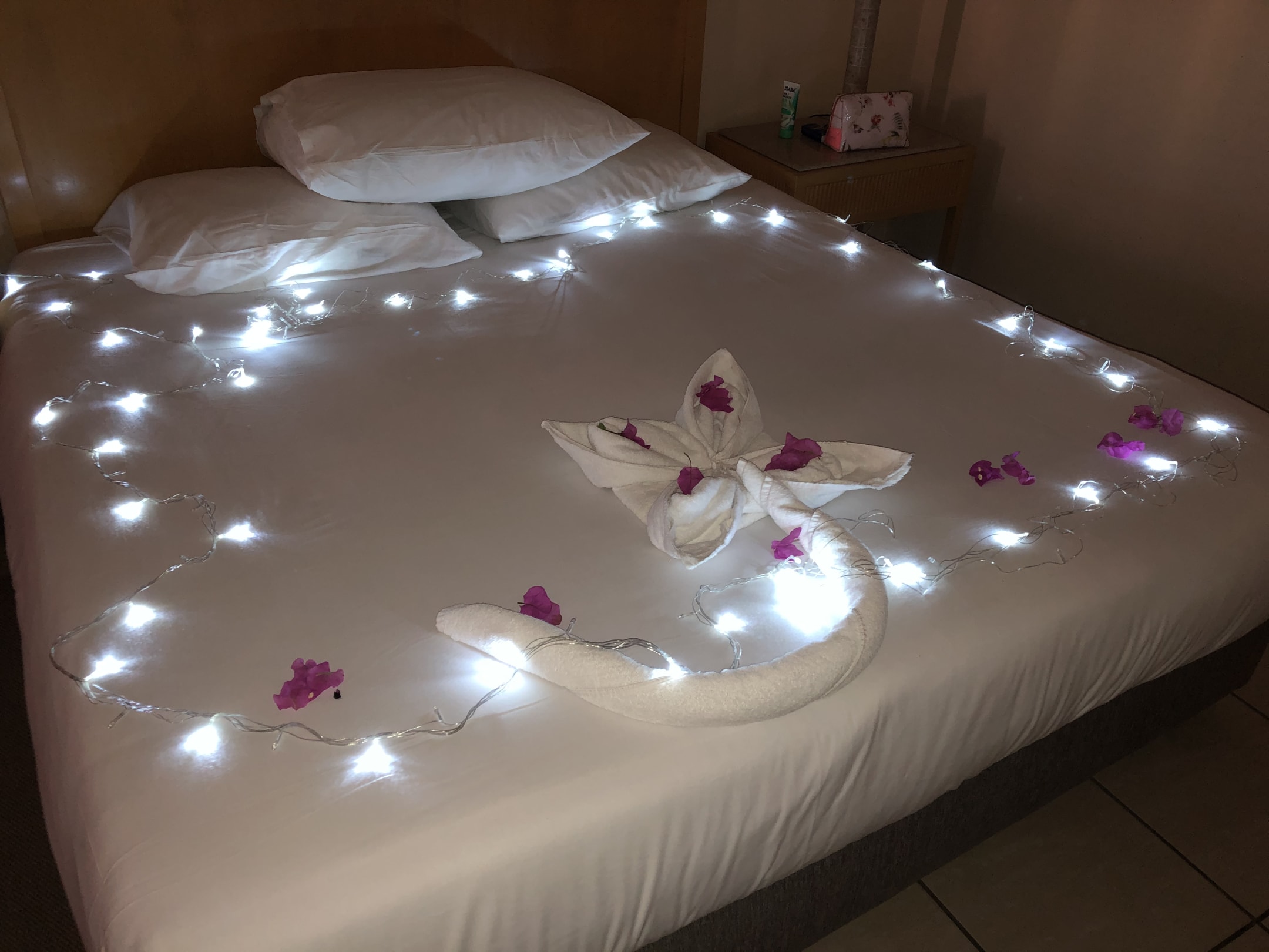 Kunstwerk aus Handtüchern, Blüten und Lichterkette vom Housekeeper