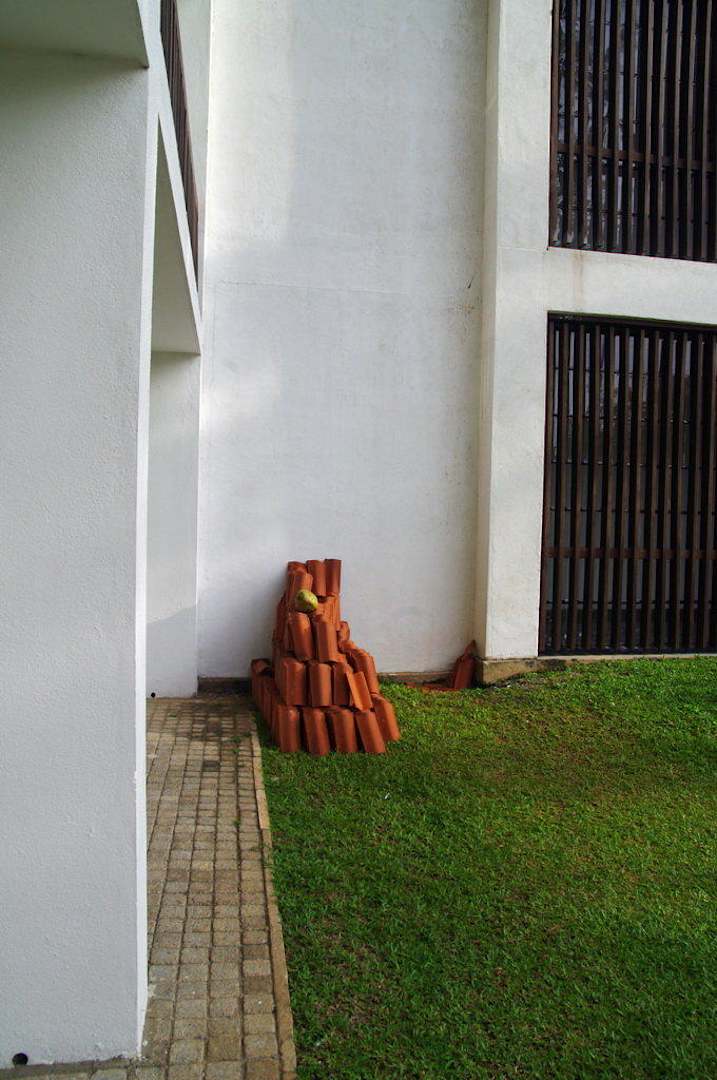 Ziegelstapel vor der TerrasseVon hier aus wurden die Ziegel mit einem einfachen Seil über drei Stockwerke auf das Dach gezogen. Häufig genug fiel dabei auch mal ein Ziegel herunter... Direkt vor der Terrasse von bewohnten Gästezimmern muss das nicht sein!