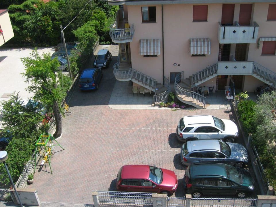 Blick von der Dachterrasse des Hotels auf Nebengebäude u. einen von zwei Parkplätzen.