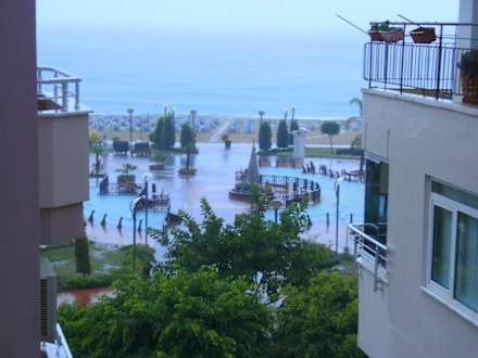 Außenansicht seitwärts vom Hotelzimmer. Blick auf Wasser Parkanlage und Strand.
