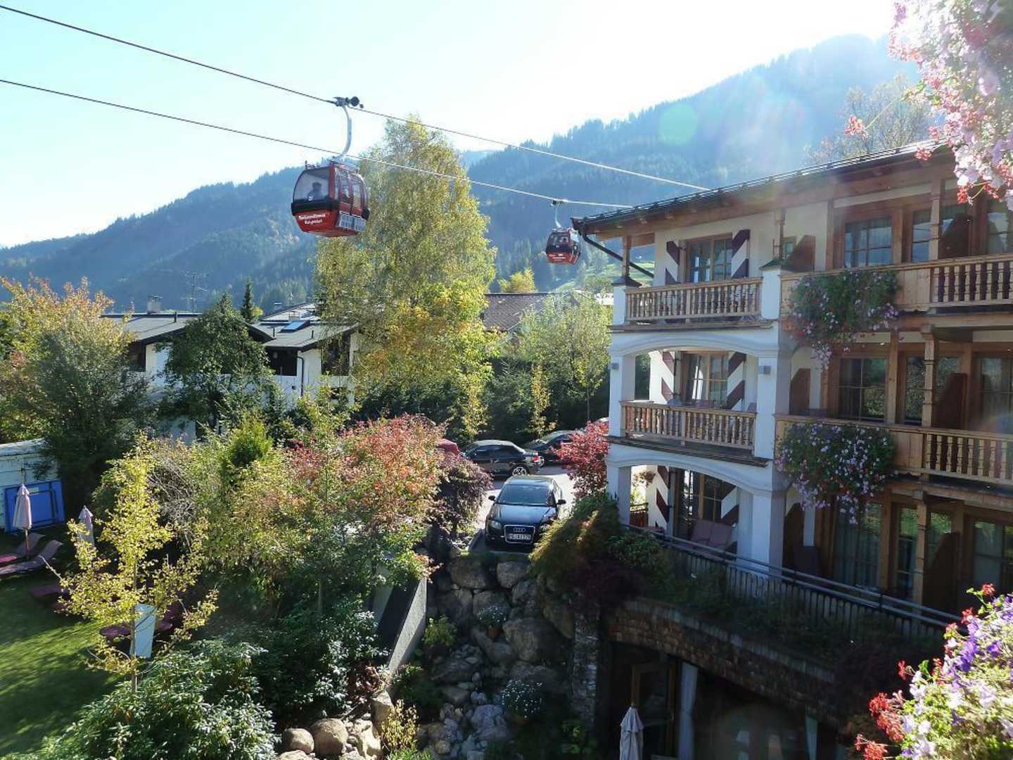 Blick auf die Hahnenkammbahn vom Balkon