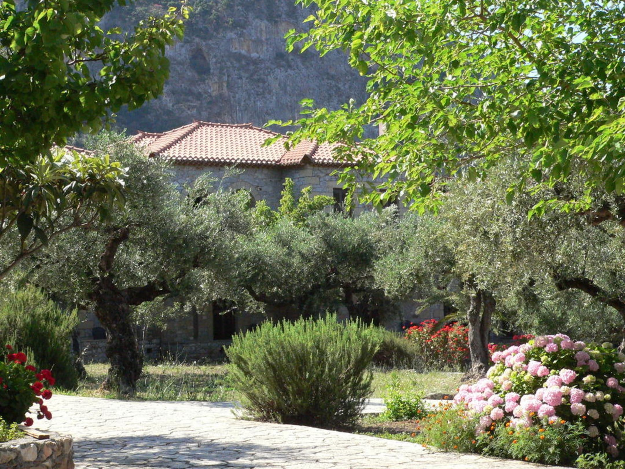 Blick von der Frühstücksterrasse auf Gartenanlage in Richtung Studios.
