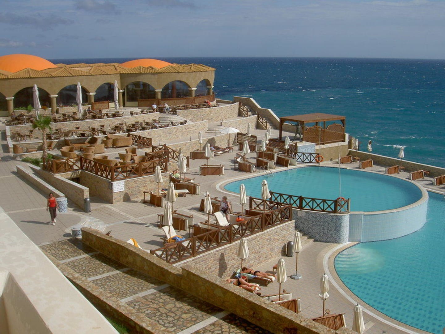 Von einem Ziimmer aus,habe ich dieses Foto gemacht.Pollanlage und Speisesaal des Hotel Kalithea Horizon Royal. Winderschön und mir Herzen gebaut.