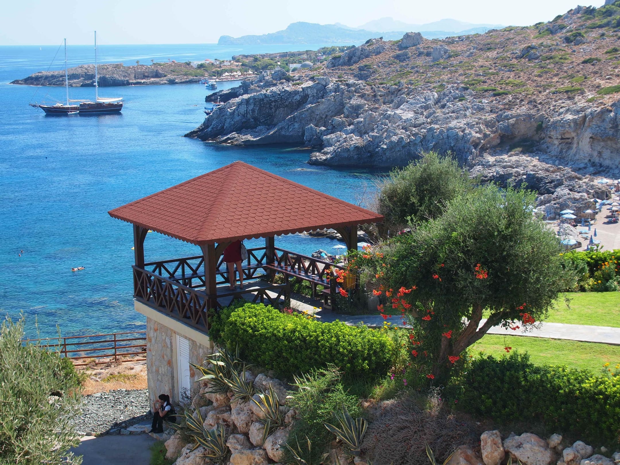 przepiękny widok na zatokę i plażę (po prawej); w głębi widoczne Termy Kalithea