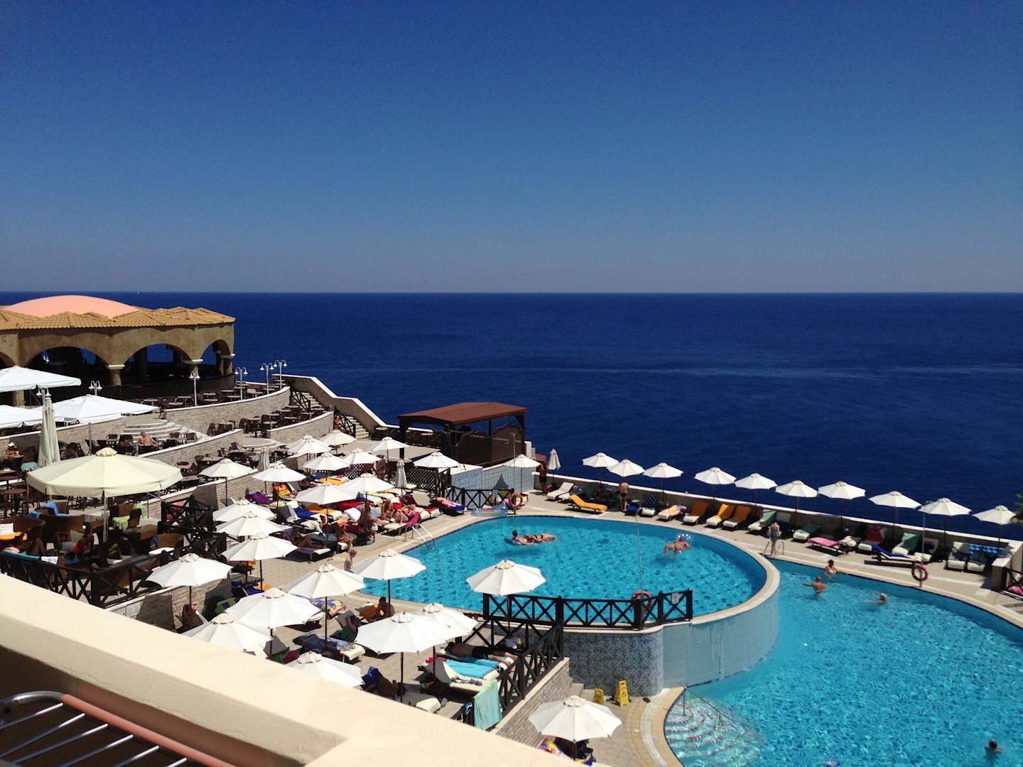 Blick vom Balkon auf Meer, Pool und Restaurant.