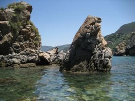 Diese Felsen sind direkt vor unserer Sonnenliege und laden immer zum Schnorcheln ein. Sie sind abends beleuchtet und ein Blickfang von der Terrasse Hotel Kaluras direkt davor.