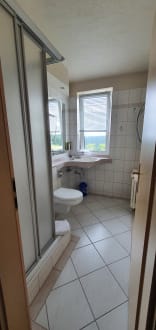 ZimmerBad und Dusche sehr klein, kaum Ablagen, Toilettenspülung geht nur mit heruntergeklappter Brille